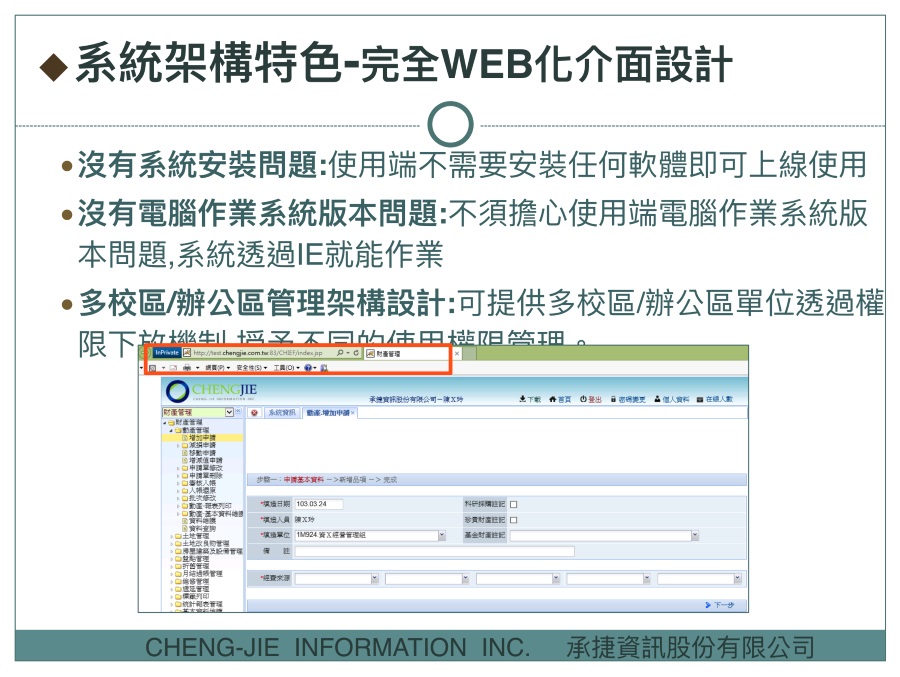 承捷公司多年來深耕於政府機關經營有關財物管理相關管理系統, 所有員工均具有公務機關資訊推動實務經驗, 從 95 年開始承接政府機關財物管理相關系統專案開發,市場佔有率高, 並於 102 年開始涉及農產品外銷出口、禽肉電宰、蛋品食安相關產品之溯源流程整合規劃設計。