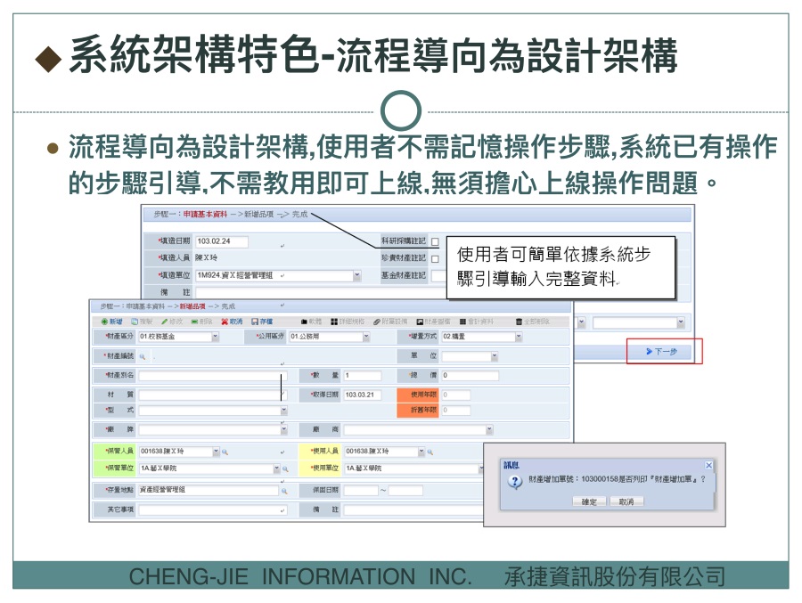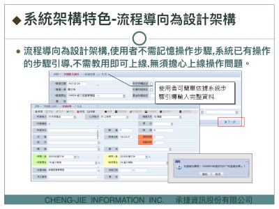 針對各機關消耗性物品的線上領用、申請進度查詢、主管審核、物品發放、入出庫管理、盤點、領用退回、報銷等作業設計, 採流程導向架構,提供引導步驟操作,簡單人性化介面,快速熟悉系統操作流程,使用者容易上手,無預擔心上線操作問題, 適用於各機關多人全面使用,效率卓越。